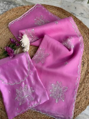 Saree: Pure Organza Silk with hand Aari embroidered borders & buta, hand-scalloped finish (5.5 meters) Blouse: Pure Silk with hand embroidery (1 meter) Ideal for: Weddings, festive occasions, elegant day functions, and traditional celebrations. A timeless handcrafted creation that blends delicacy, elegance, and heritage artistry.