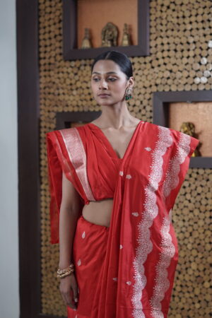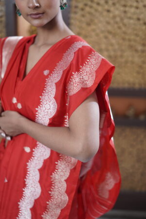 Product- Pure Handloom Banarasi Katan Silk Kadwa Double Border Sona- Rupa Saree Fabric- Pure Katan Silk Colour- Red Pattern- The saree is enhanced with a double zari border, adding richness and grandeur to its traditional appeal. Technique- Kadhwa technique Blouse- Comes with a plain fabric complemented by a matching border.