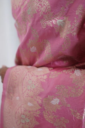 Product- Pure Handloom Banarasi Katan Silk Kadwa Alfi Jangla Saree Fabric- Pure Katan Silk Colour- Baby Pink Pattern- The saree features the elegant Alfi Jangla pattern, where delicate floral vines spread gracefully across the body. The zari work in gold and silver threads adds a subtle shimmer, enhancing its regal beauty. Technique- Kadwa Weave Blouse- Comes with a plain fabric…