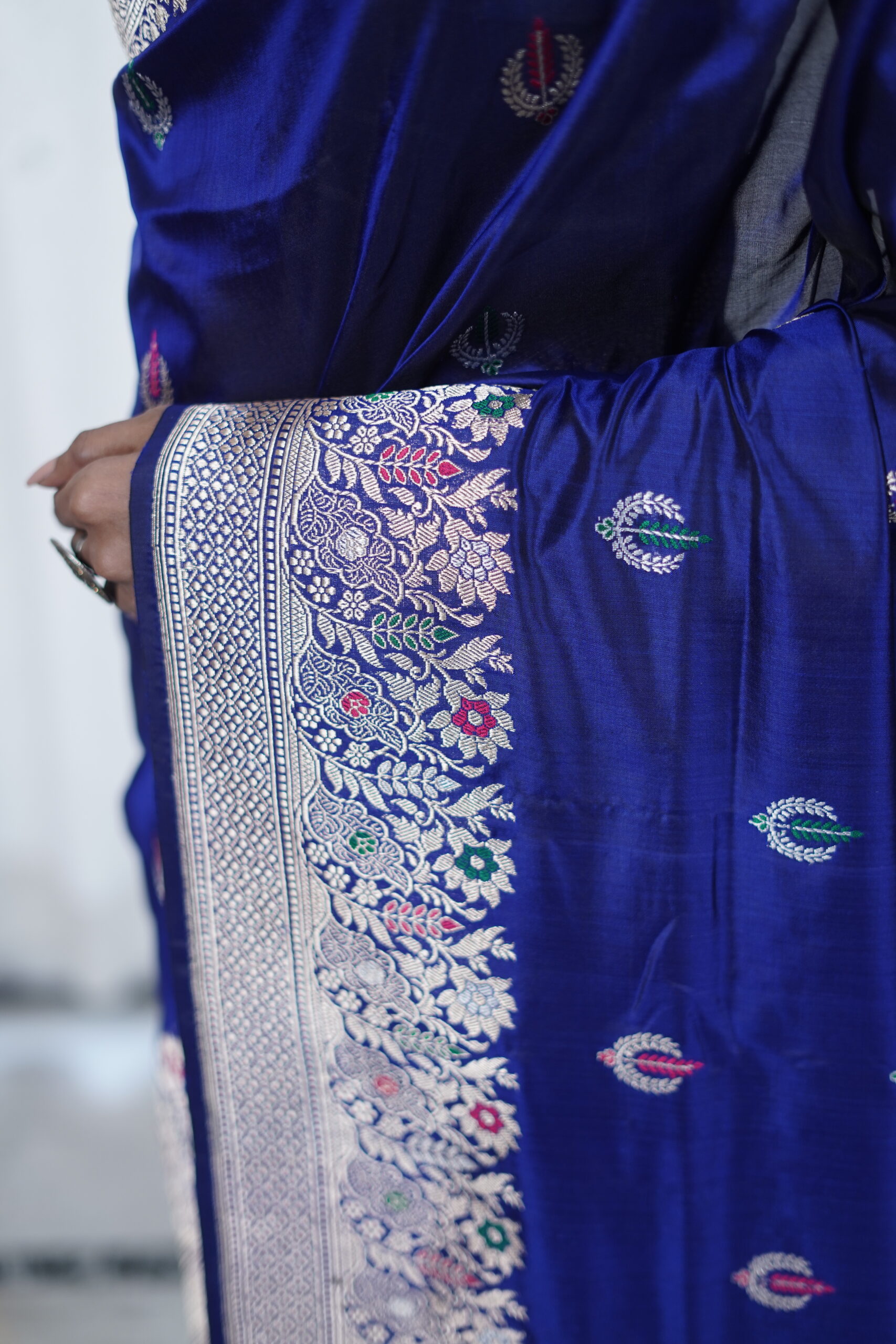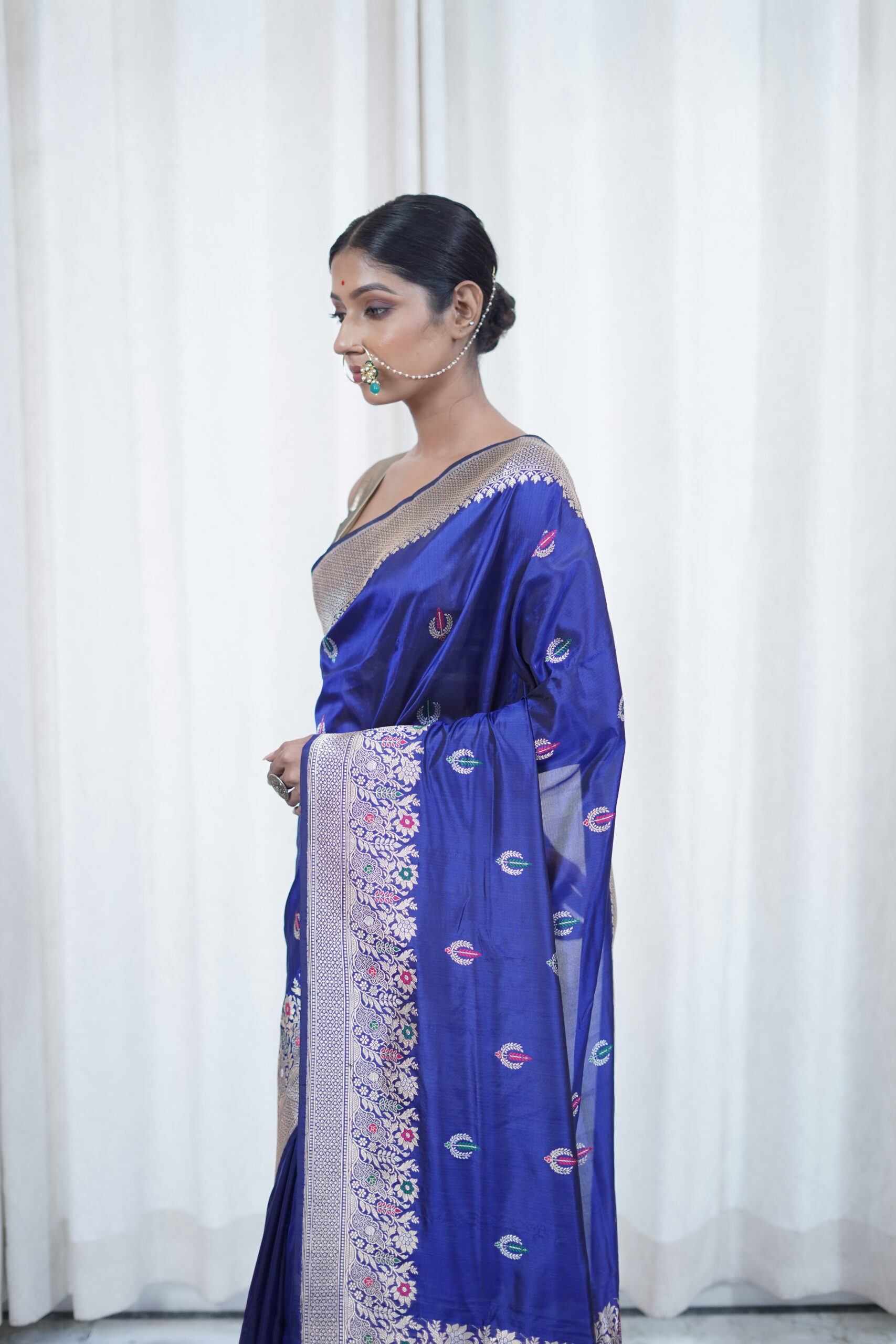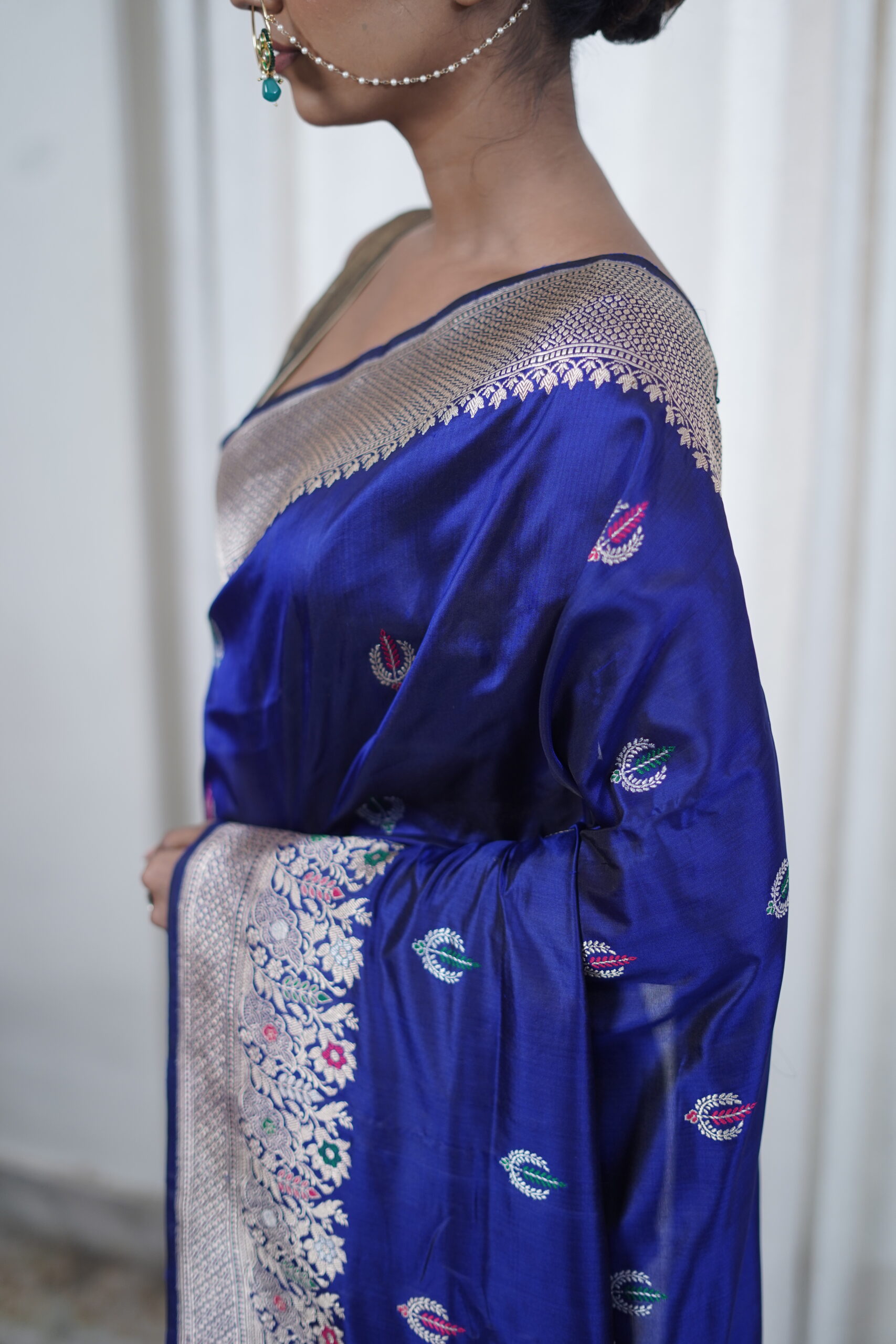 Pattern- Decorated with fine Alfi booti motifs, it shines with subtle richness on a blue base. Finished with an intricate Banarasi border and pallu,