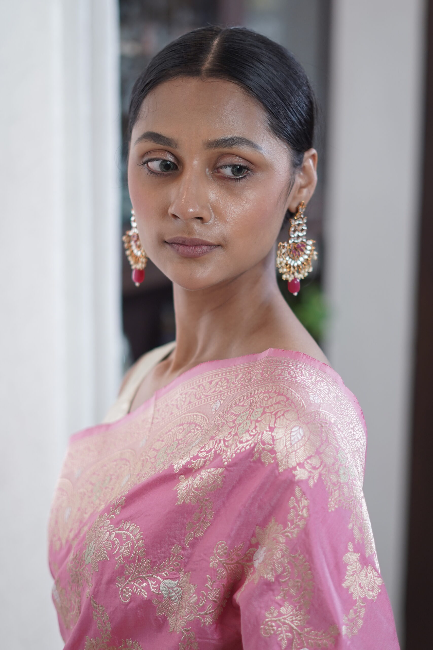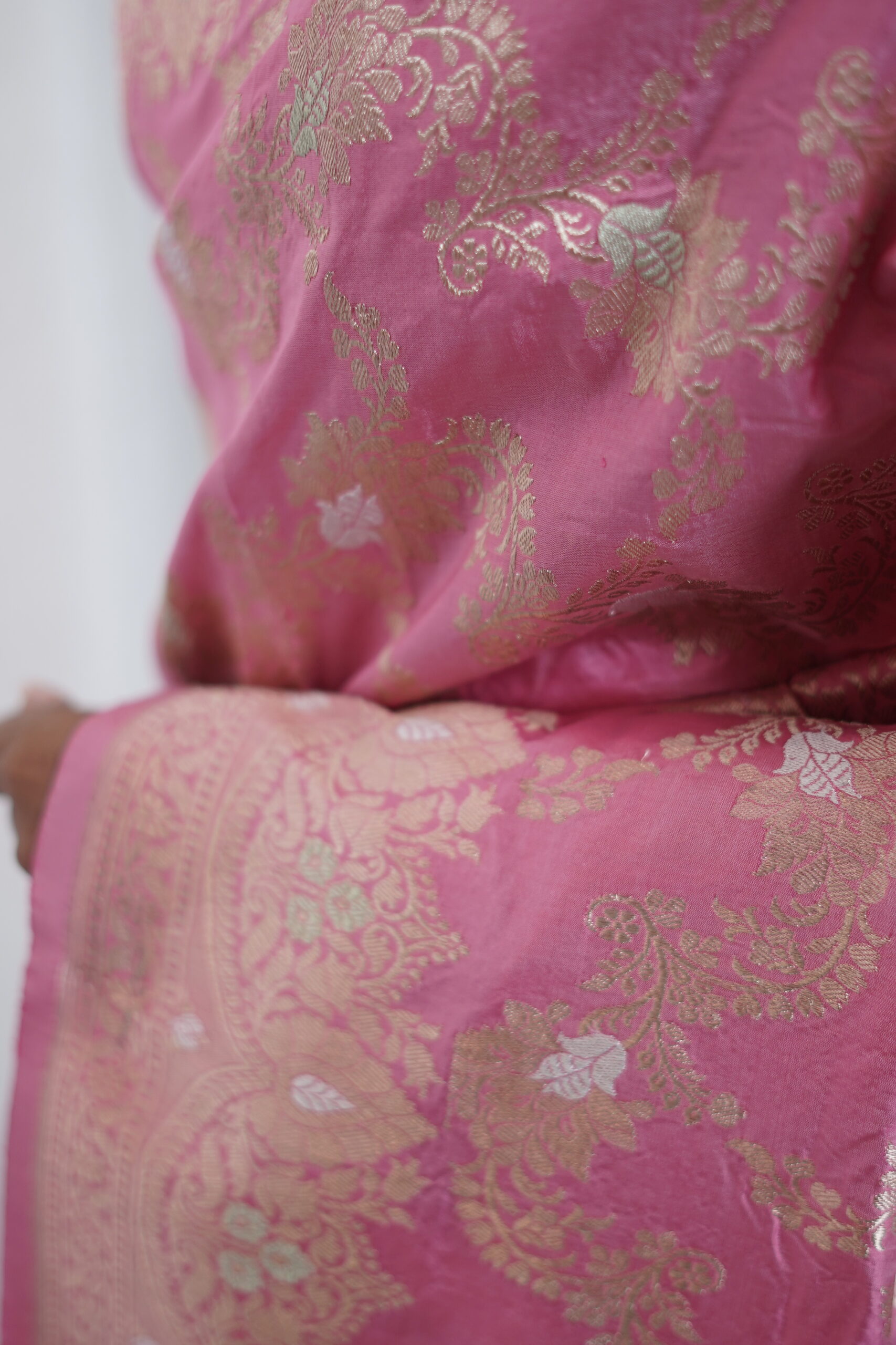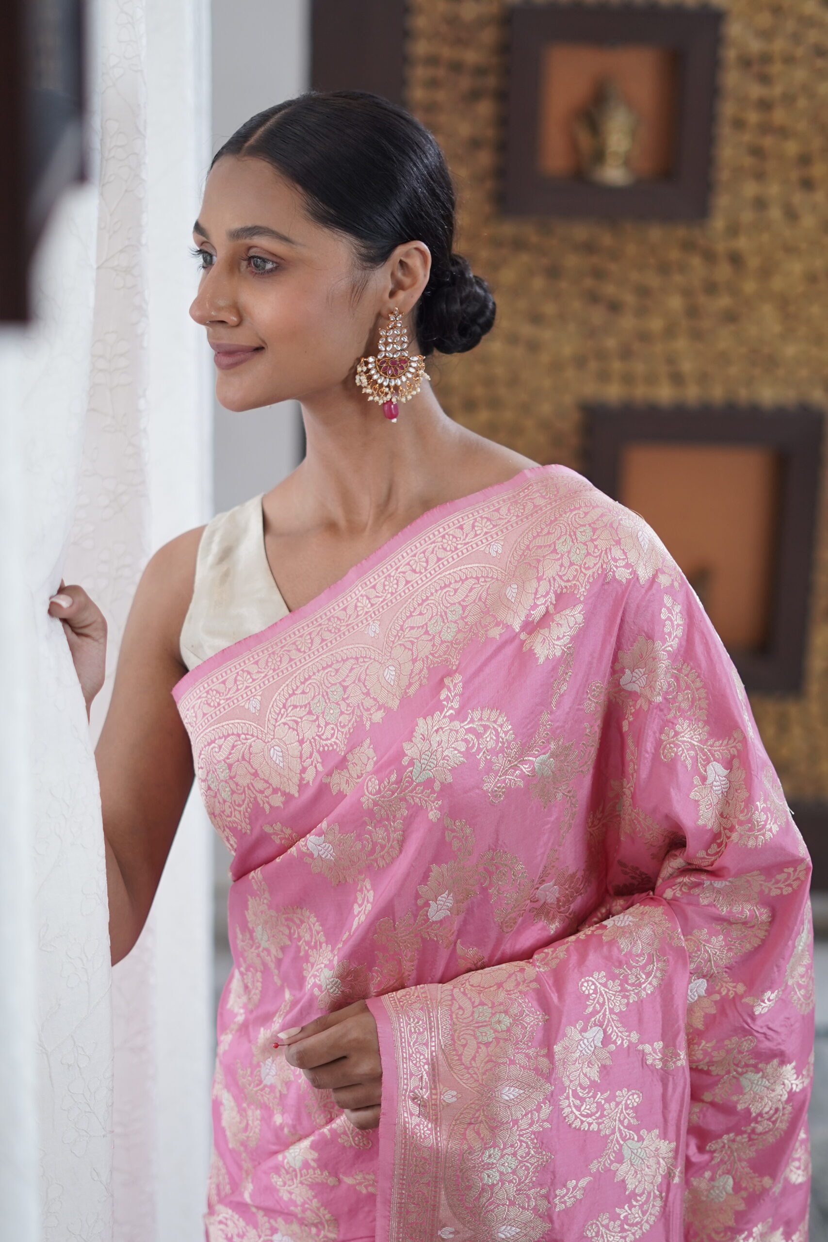 Embrace elegance with this Jangla Weave Concept Baby Pink Pure Katan Silk Banarasi Saree, embellished with intricate floral motifs that dance across its rich fabric. Made from luxurious Katan silk