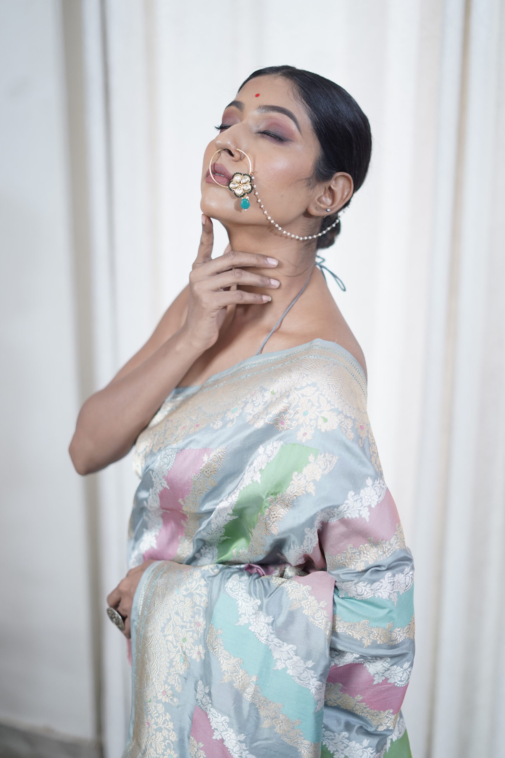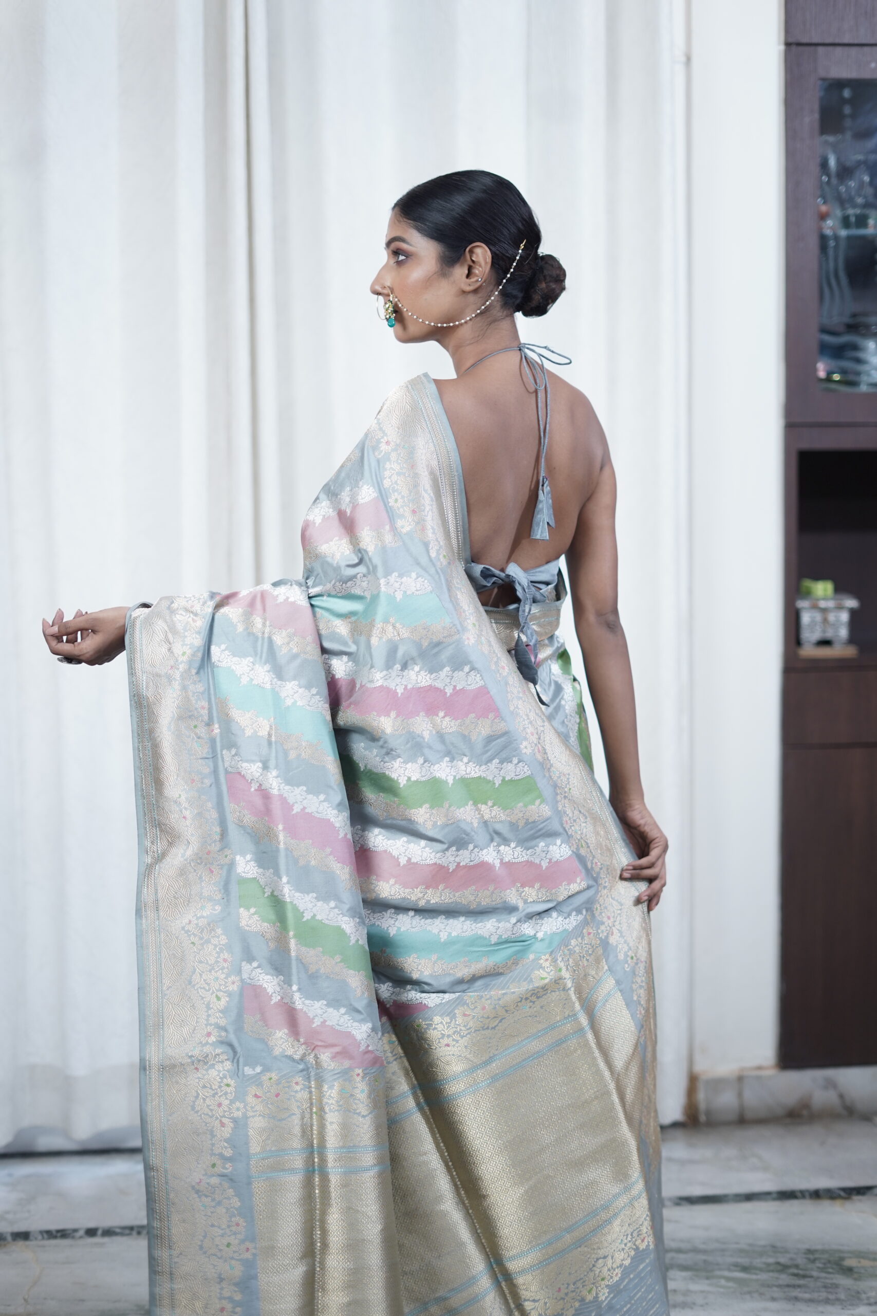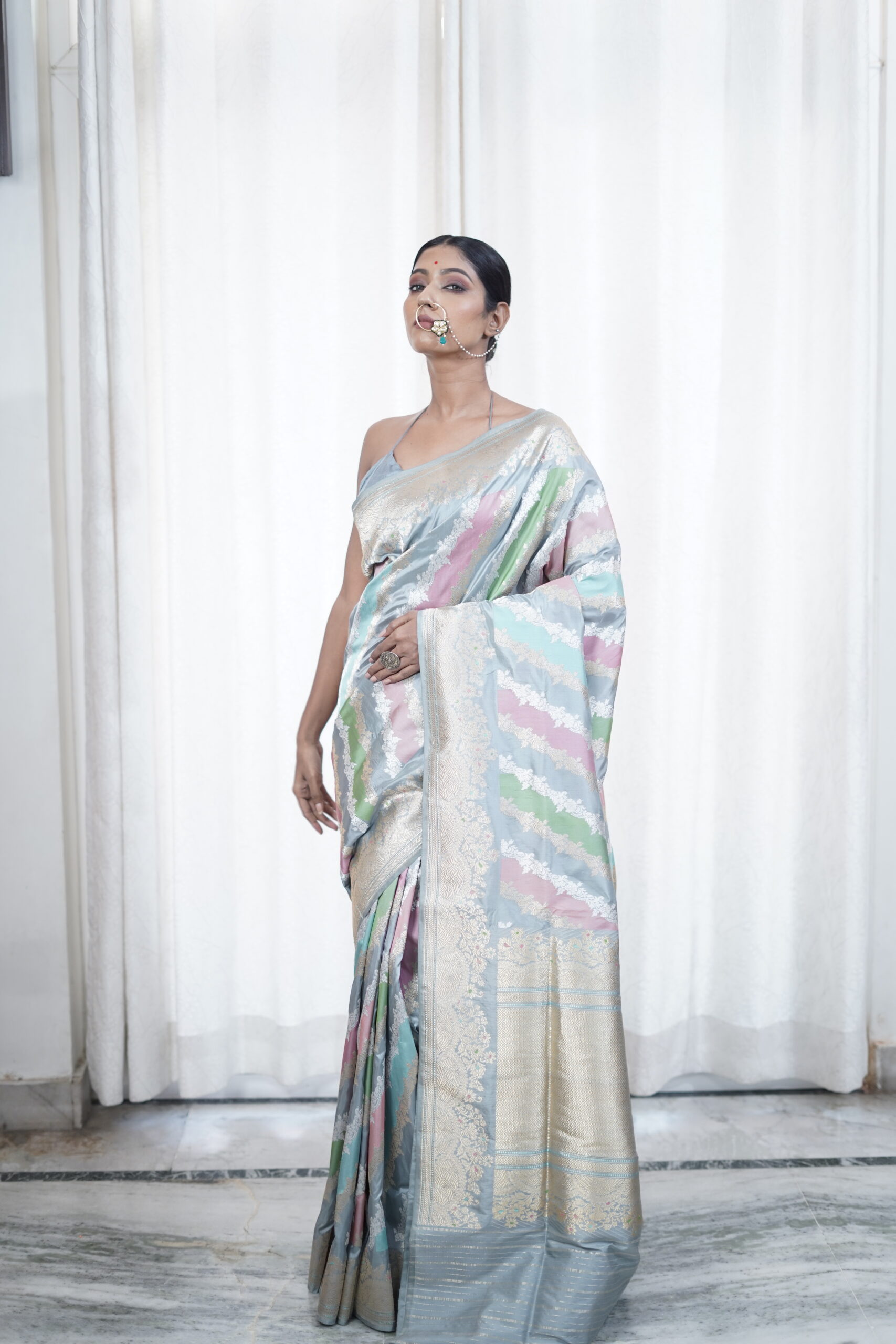 Originating from Varanasi, Banarasi Rangkat sarees are a captivating fusion of luxurious Banarasi silk and intricate Rangkat weaving. Celebrate the timeless artistry of Banaras with our Grey Pure Katan Silk Rangkat Saree, beautifully crafted in the traditional Kadwa weave.
