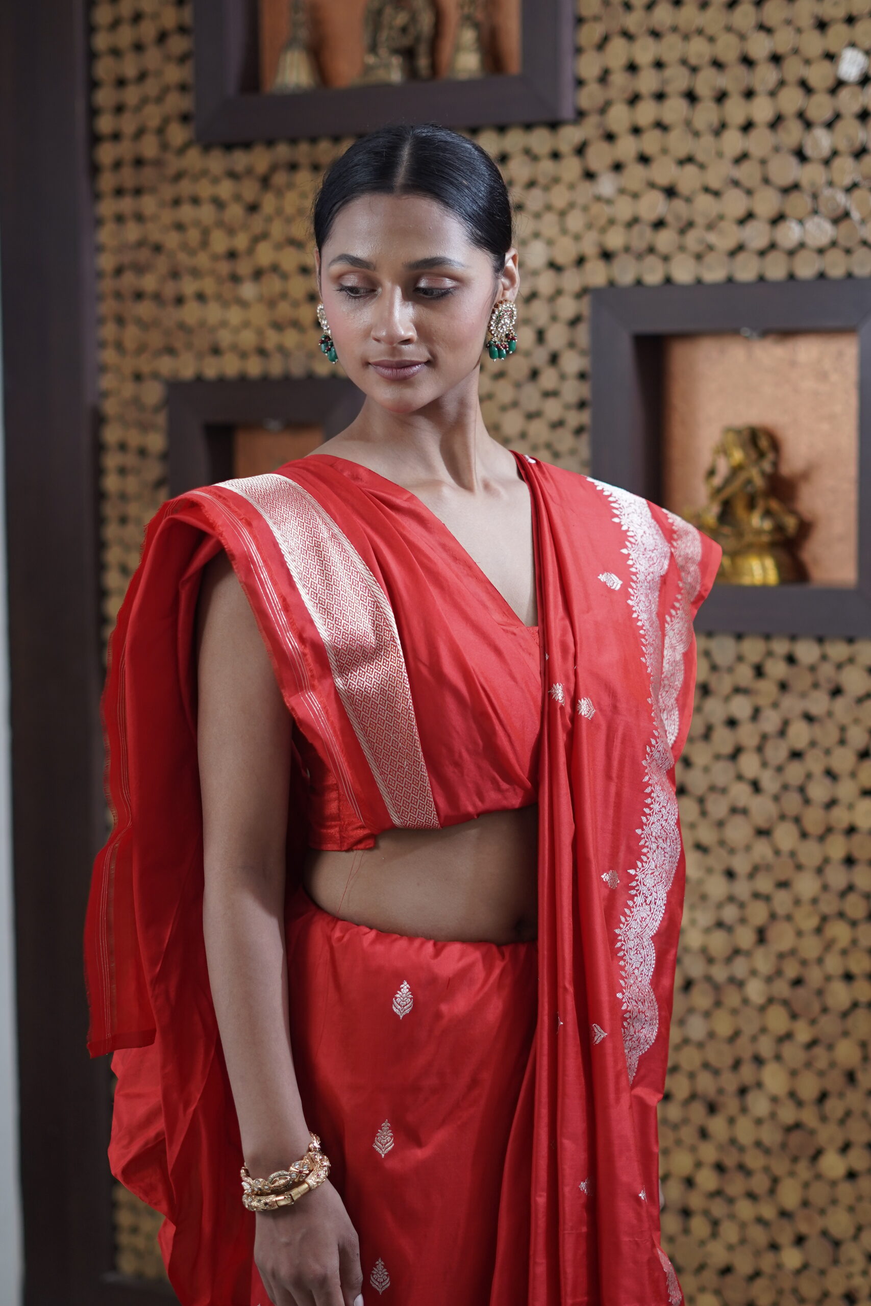 Gracefully bordered in Sona-Rupa zari, the saree radiates sophistication and the timeless charm of Banarasi tradition. Elegant and timeless, it’s a perfect drape for festive and grand occasions.