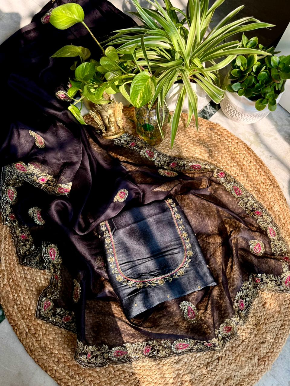 Saree: Pure Organza Silk with hand Aari embroidered borders & buta, hand-scalloped finish (5.5 meters)