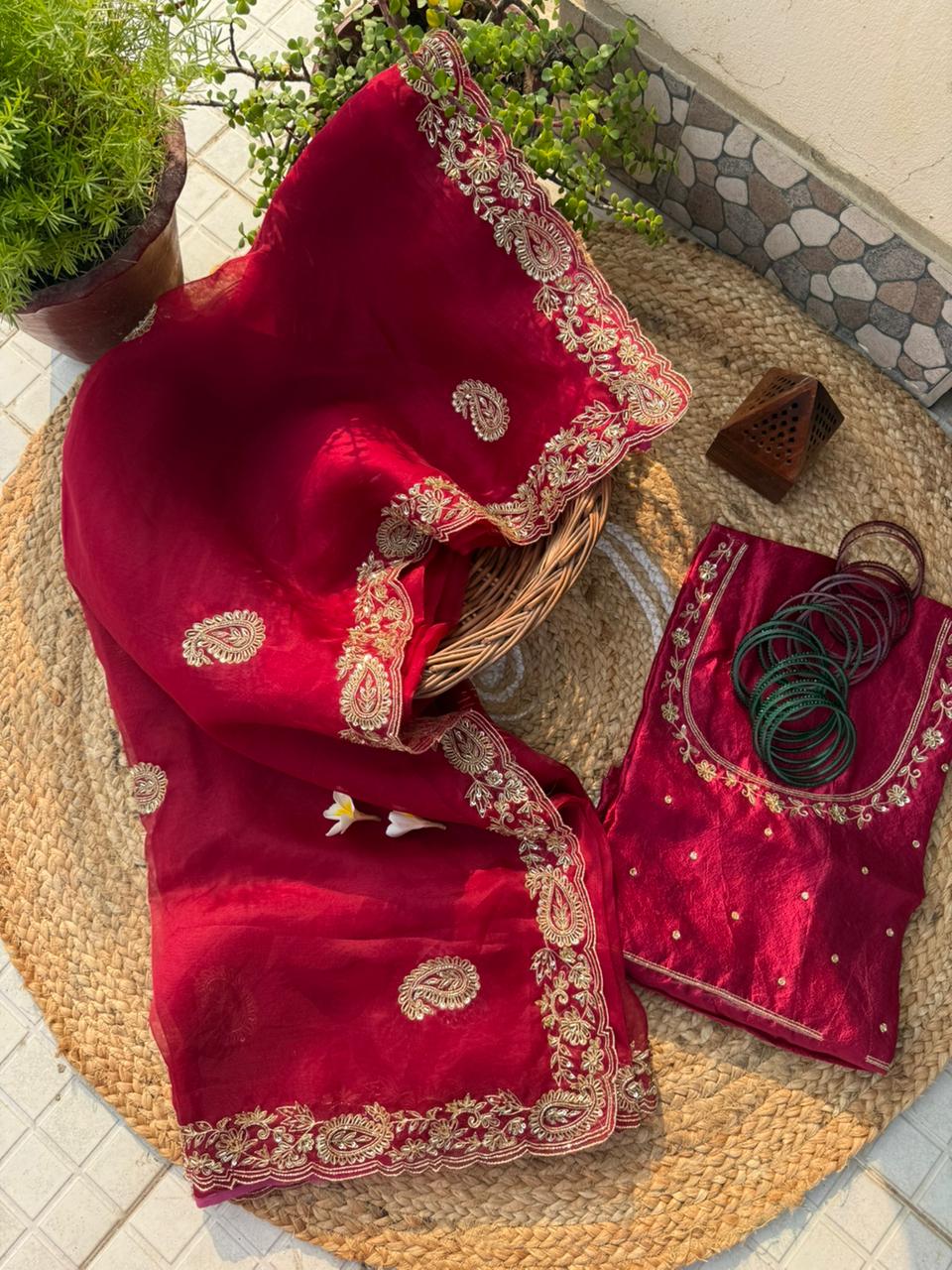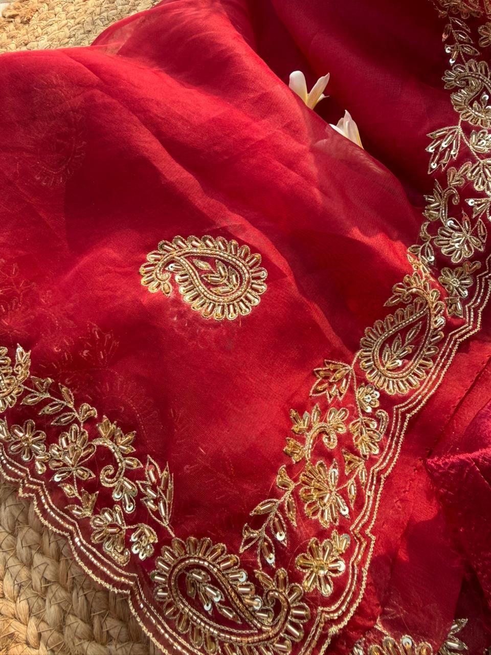 Saree: Pure Organza Silk with hand Aari embroidered borders & buta, hand-scalloped finish (5.5 meters)