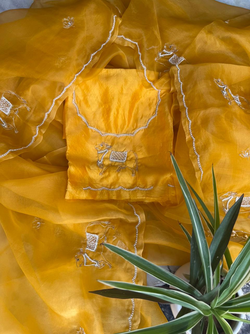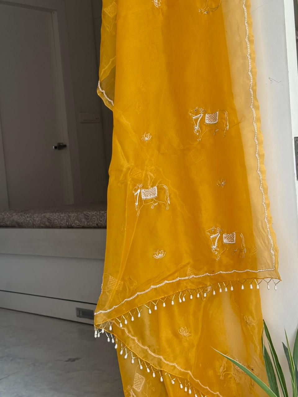 A poetic blend of art and elegance, this Pure Organza Silk Saree is inspired by the timeless beauty of Pichwai motifs. The delicate organza base is exquisitely adorned with pearl zari hand Zardosi embroidery, showcasing fine craftsmanship and intricate detailing that feels both regal and artistic.