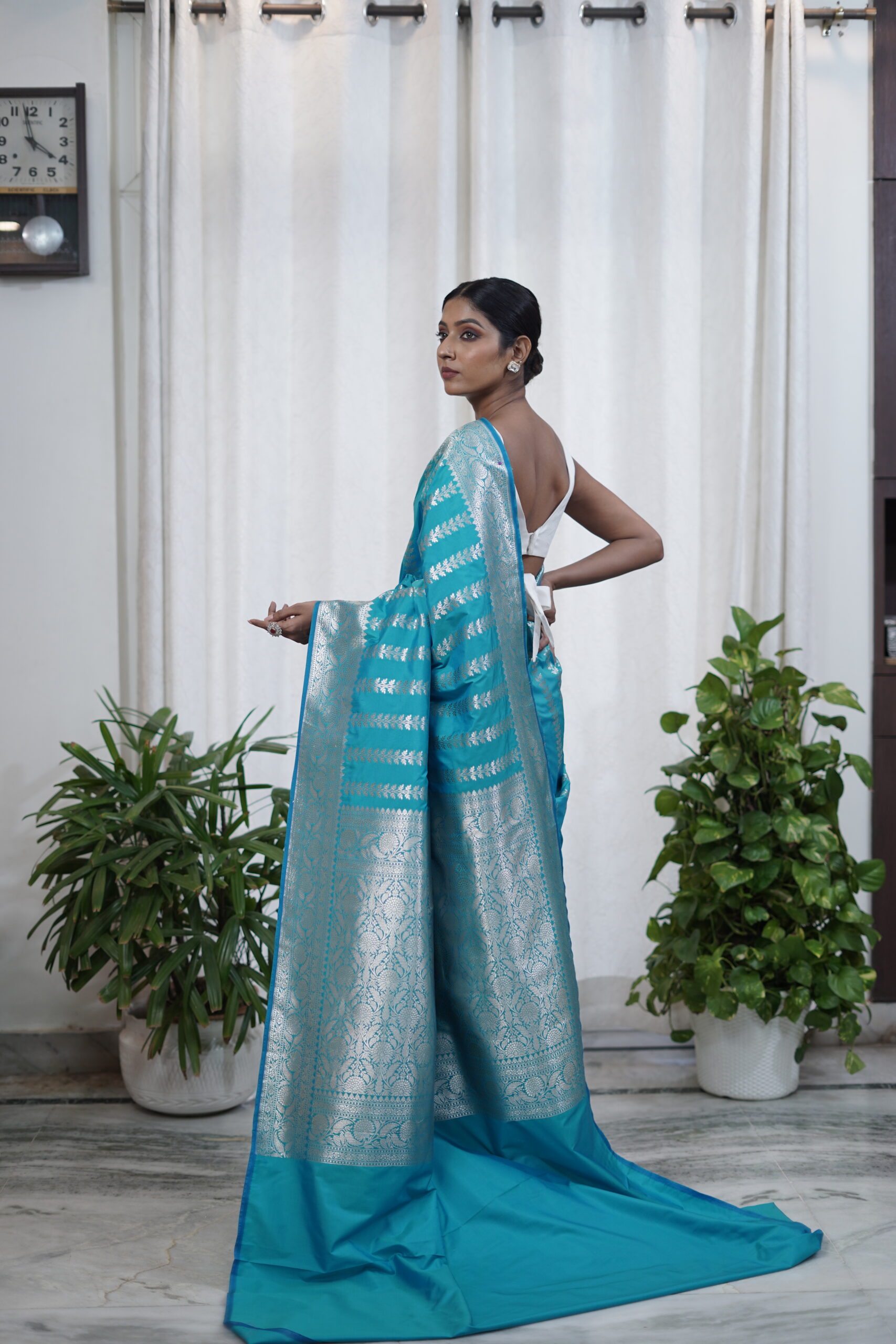 Step into timeless elegance with this exquisite Semi Katan Handloom Banarasi Saree, a beautiful blend of traditional artistry and modern sophistication. Meticulously handwoven by skilled artisans of Banaras