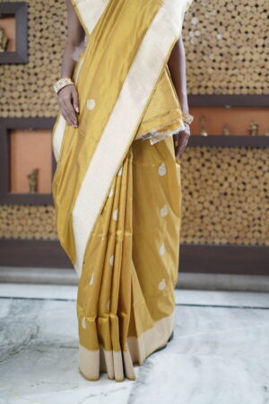 - Product- Pure Handloom Banarasi Katan Silk Kadwa Sona- Rupa Border- Buti Saree Fabric- Pure Katan Silk Colour- Mustard Pattern- This Pure Handloom Banarasi Katan Silk Saree features exquisite Kadwa weaving with finely detailed Sona-Rupa (gold and silver) zari butis adorning the body Technique- Kadhwa technique Blouse- Comes with a plain fabric complemented by a matching border