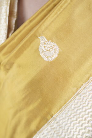 - Product-Pure Handloom Banarasi Katan Silk Kadwa Jangla Sona- Rupa Saree Fabric- Pure Katan Silk Colour- yellow Pattern- Handcrafted using the intricate Kadhwa technique, this saree features a captivating Shikargah jaal pattern woven in rich golden and silver zari, creating a mesmerizing all-over shimmer. Technique- Kadhwa technique Blouse- Comes with a plain fabric complemented by a matching border