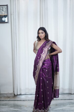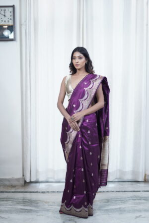 - Product- Pure Handloom Banarasi Katan Silk Kadwa Double Border Sona- Rupa Saree Fabric- Pure Katan Silk Colour- Purple Pattern- The saree radiates royal charm with its exquisite Sona-Rupa zari work, where gold and silver threads intertwine to create a divine shimmer across the fabric. Its double border design adds depth and grandeur, framing the saree with a rich, traditional elegance…