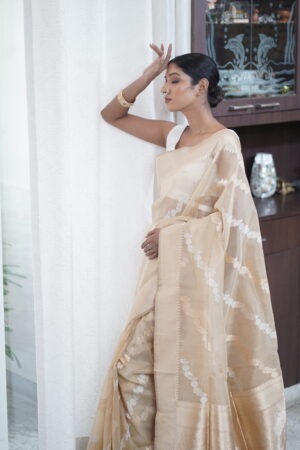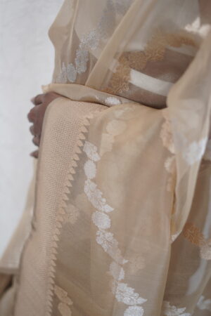 - Product- Pure Handloom Banarasi Kora Silk Kadwa Sona-Rupa Jangla Saree Fabric- Pure Kora Silk Colour- Beige Pattern- The saree features an enchanting Sona-Rupa Jangla pattern, where intricate gold and silver zari vines flow gracefully across the soft beige base, creating a luxurious all-over floral design. Technique- Kadwa Weave Blouse- Comes with a plain fabric complemented by a matching border.